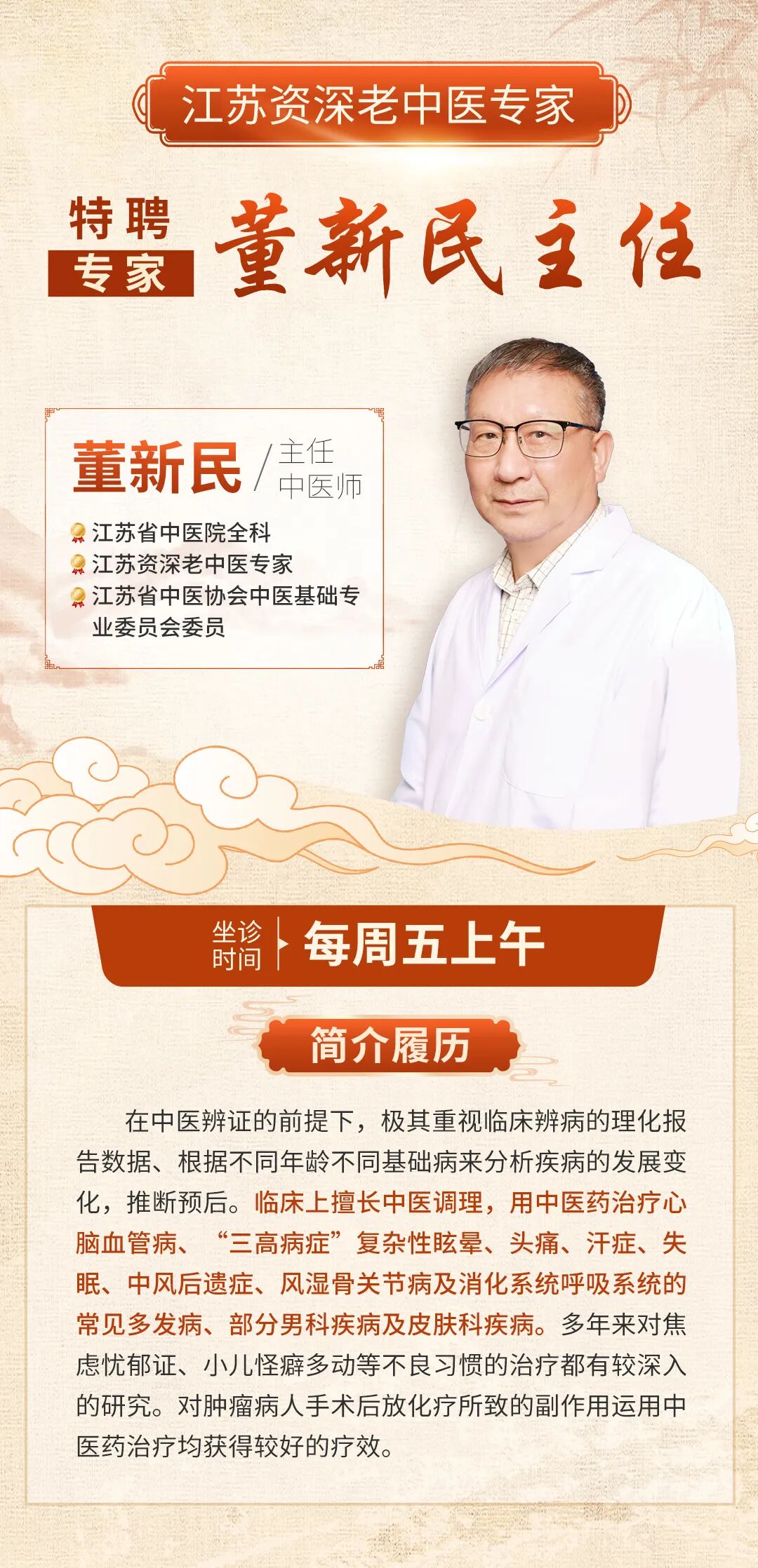如果出现头晕、头痛、胸闷等情况应尽快就诊,由医生根据患者的年龄、体重、体质等具体情况来调整、优化用药方案。3月13日本周五上午,江苏省中医院主任中医师董新民主任将在南京仁品耳鼻喉专科医院坐诊,指导高血压患者科学控压,平安度过季节交替期。