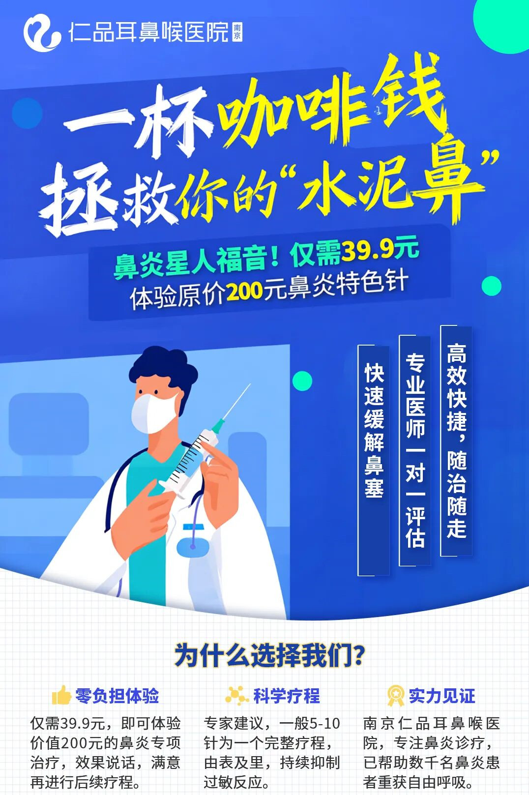 为了让更多饱受鼻炎折磨的患者亲身体验“鼻炎针”的效果,南京仁品耳鼻喉专科医院特推出鼻炎针低价体验活动,原价200元的鼻炎针,现仅需39.9元即可体验一次!