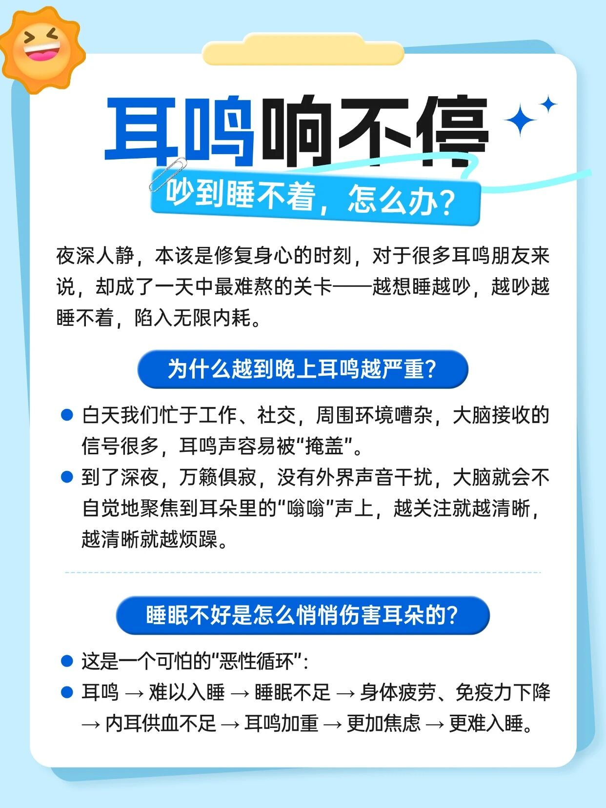 “一沾枕头耳朵就嗡嗡响,这觉真是没法睡了……”夜深人静,本该是修复身心的时刻,但对于很多耳鸣朋友来说,却成了一天中最难熬的关卡。越是想睡,耳朵里的“蝉鸣”、“电流声”就越清晰,简直会让人emo!