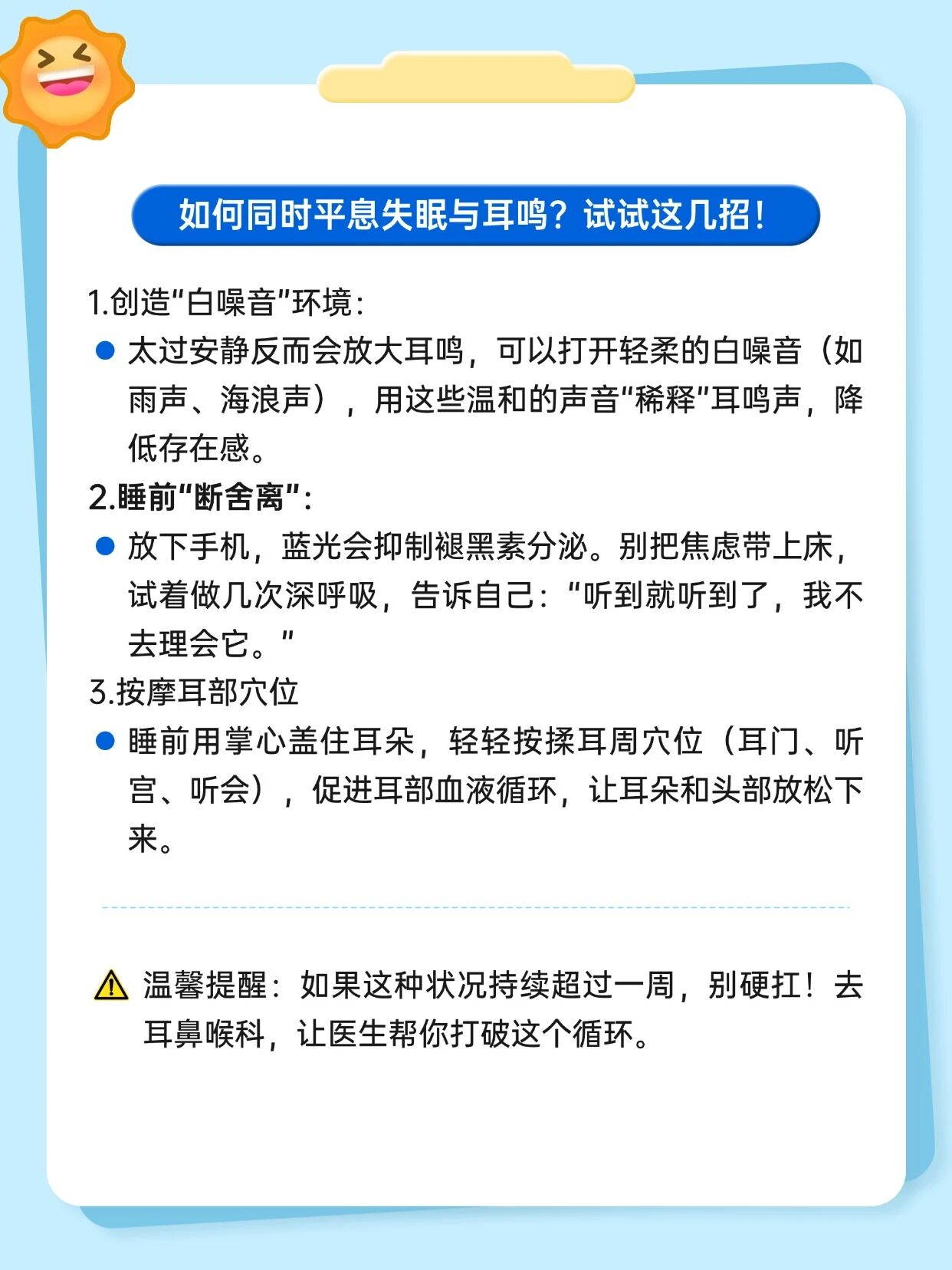 3、寻求专业帮助:如果这种状况持续超过一周,别硬扛!去耳鸣专病门诊,让医生帮你打破这个循环。