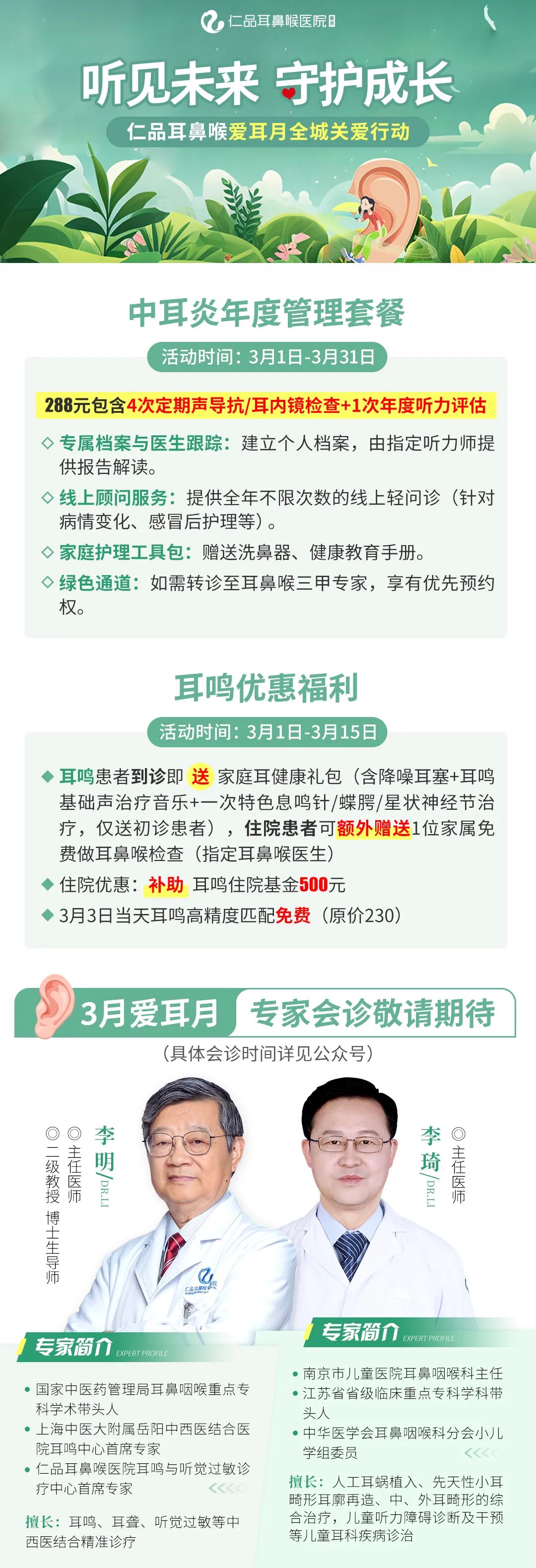 看病难,看名医更难!爱耳月期间,除了给力的福利政策,南京仁品耳鼻喉医院还将特别邀请到两位重量级耳科权威专家到院会诊——